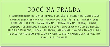 Mas hoje por portas e travessas cheguei a um "diz que é uma espécie de Baby Blog" que me surprendeu, escrita fluida e divertida, rica em figuras de estilo, próxima dos leitores e da essência humana, trata-se de um personal baby blog, em que a autora narra as suas experiências de mãe e mulher, Coco na Fralda para seguir atentamente.